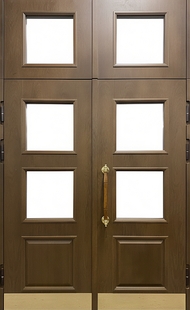 Двустворчатая остекленная термодверь с фрамугой, отбойниками и отделкой МДФ — идеальное решение для тех, кто хочет подчеркнуть статус и вкус. Панели из МДФ доступны в широкой палитре цветов и текстур, включая имитацию ценных пород древесины. Подчёркивают геометрию фасада и интерьера. Отделка подойдет для частных домов с кирпичной и деревянной облицовкой.