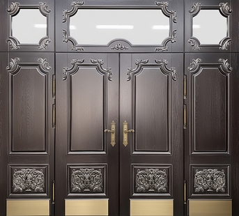 Двустворчатая парадная входная группа с терморазрывом, стеклом сверху, отбойниками и панелями МДФ с резьбой и патиной отличный выбор для оформления интерьера в любом стиле. МДФ-панели имитируют натуральную древесину, создавая эффект дорогой деревянной поверхности. Позволяют подобрать идеальный цвет под отделку здания. Дизайн делает дверь не только функциональной, но и визуально привлекательной.