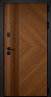Металлическая дверь с панелями МДФ коричневого цвета — подойдёт тем, кто ценит качество и выразительный дизайн. МДФ-панели подходят для использования как внутри помещения, так и на фасаде. Формируют целостный образ входной группы. Оформление подойдет владельцам домов с деревянным фасадом.
