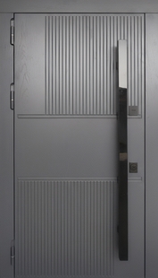 Металлическая квартирная дверь с серыми панелями МДФ и бугельной длинной ручкой сочетает в себе прочность и изысканный внешний вид. МДФ-панели создают эффект натурального дерева без необходимости сложного ухода. Подходят для оформления в стиле минимализм, лофт или модерн. Дизайн-проект подойдет для фасадов с декоративными элементами.
