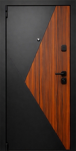 Стальная дверь с черными панелями МДФ RAL и контрастной вставкой ПВХ сочетает элегантность и инженерную надёжность. Панели из МДФ отличаются устойчивостью к влаге, перепадам температур и механическим воздействиям. Формируют целостный образ входной группы. Дизайн-проект гармонирует с любым архитектурным стилем.