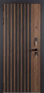 Входная дверь с отделкой МДФ и черными вертикальными рейками сочетает элегантность и инженерную надёжность. МДФ-панели устойчивы к влаге и температурным перепадам. Подчёркивают геометрию фасада и интерьера. Отделка подойдет тем, кто ищет надёжность и эстетику.