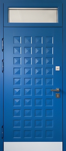 Входная термодверь с остекленной фрамугой, отбойником и синими панелями МДФ КД-1382