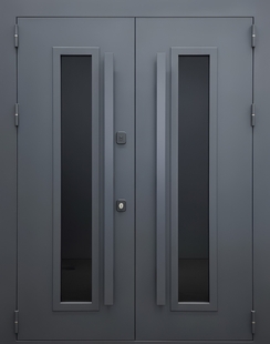 Двустворчатая остекленная термодверь с бугельными ручками и полимерным окрашиванием графит представляет собой удачное сочетание инженерной точности и дизайнерской проработки. Благодаря применению современных материалов дверь подходит для использования в жилых и коммерческих пространствах.